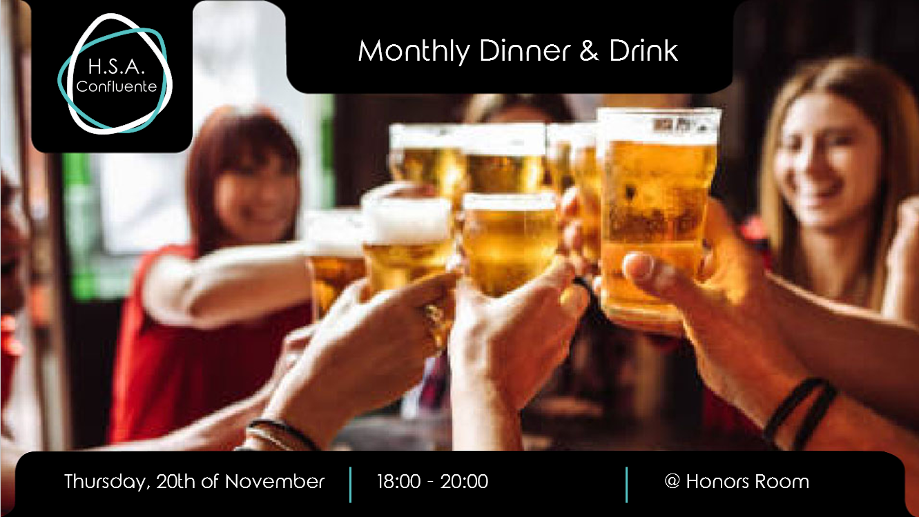It’s time for our third monthly dinner & drink of the year! Join us on the Thursday, the 20th of November at 18:00 for a for a nice meal🥘 for only 2 euros of contribution💸!
